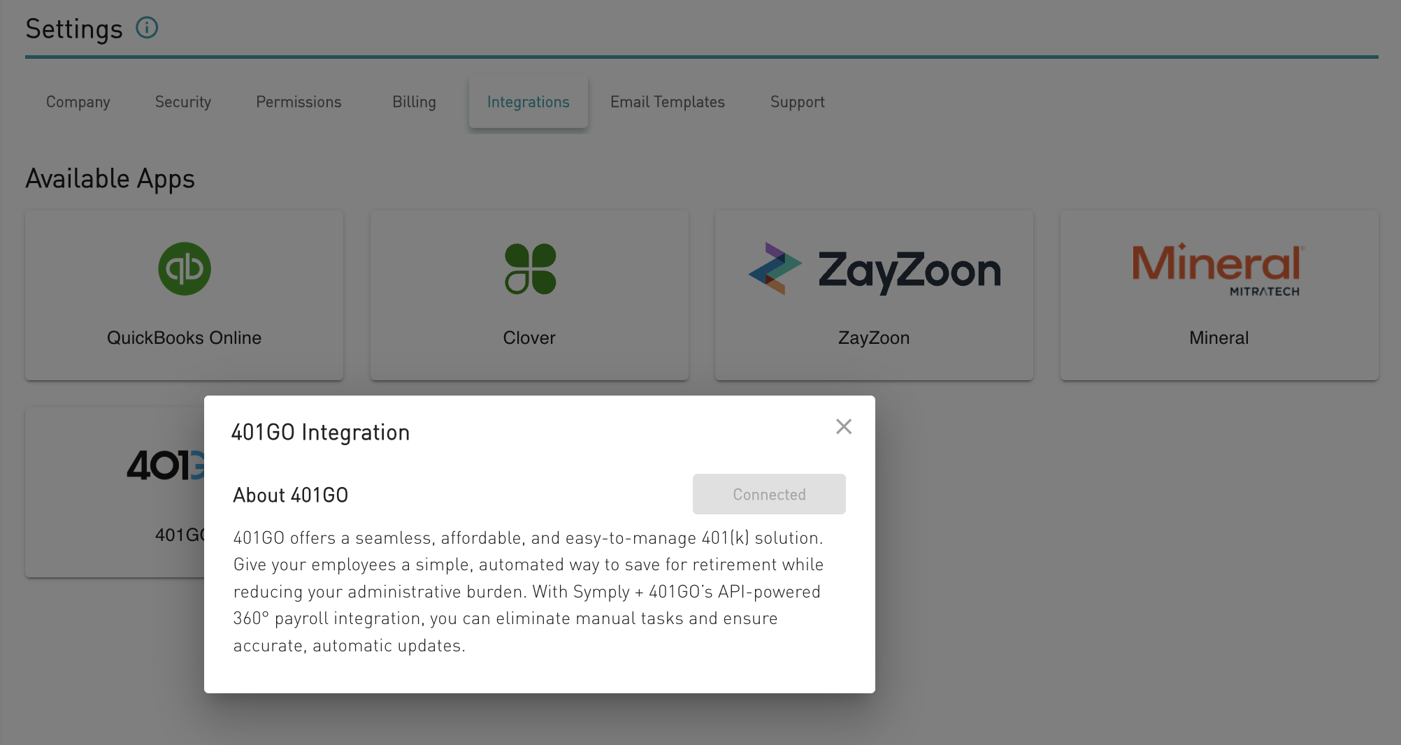 This article goes over steps to connect Symply and 401go